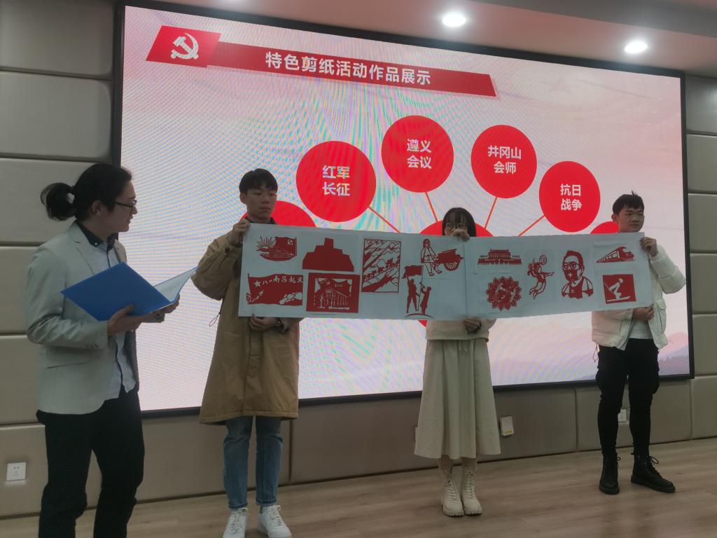 四个小组分别上台以舞台剧、诗歌朗诵、经典诵读、志愿服务的形式呈现出党史学习教育过程中的思考与感悟,以献礼中国共产党成立一百周年。其中第二小组现场演绎了肖文儒、屠呦呦、钟南山等人物故事中的经典片段;第四小组全体成员身着白衬衫,胸前佩戴党徽,进行了“请党放心、强国有我”诗歌朗诵。第六小组以特色剪纸的形式回顾了党百年奋斗历程中的重大事件。实践汇报引来了全场的阵阵掌声,也掀起了在全体党员中学党史,悟新知活动的又一次高潮。