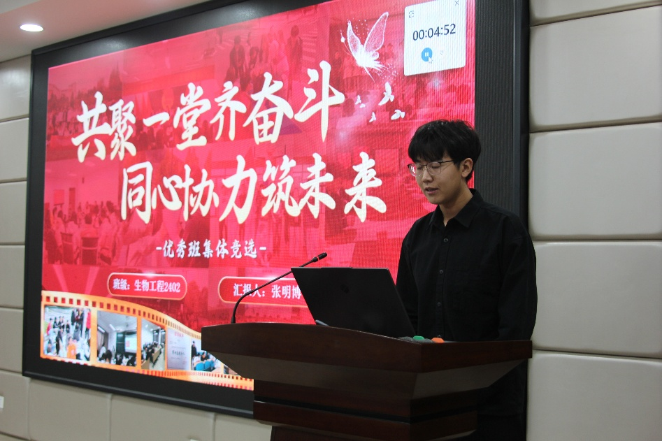 答辩环节中,各候选班级围绕班级思想建设、学风培育、文体活动、志愿服务、特色品牌打造及凝聚力建设六大核心方向,全面复盘过去一学期的创建工作成效,展开详实汇报。其中,生物2304班创新推行“班级贡献点制”,以公开透明的数据化管理模式精准量化班级成员在各项工作中的贡献度,激发全员参与班级建设的积极性;生物2203班深耕志愿服务领域,累计超2000小时的集体志愿服务时长,生动诠释了青年学子服务社会、勇担使命的责任与担当;食品2401班则以“协作式”班级团建为抓手,通过系列互动性强、参与度高的活动,营造出活泼向上、团结奋进的班级氛围。各班汇报亮点突出、特色鲜明,充分展现了食品学院基层班级建设的丰硕成果与新时代学子的蓬勃朝气。