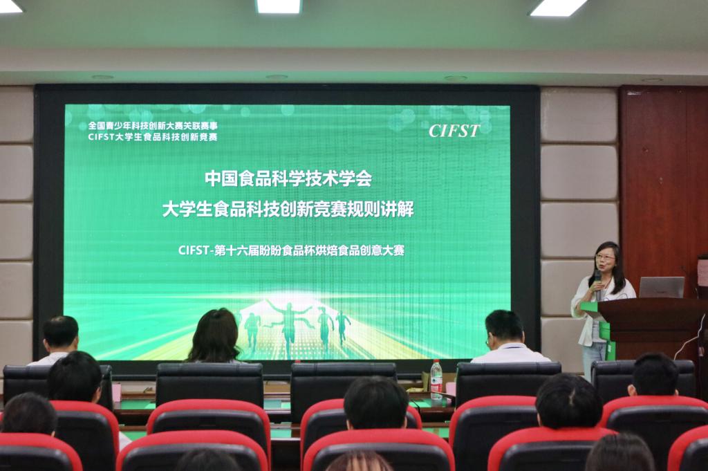 首先,程云辉教授播放了中国食品科学技术学会宣传片,并从竞赛宗旨、参赛高校、基础要求、竞赛方向等方面对赛事进行了全面介绍。她重点解读了竞赛规则,包括基本规则、参赛方法、竞赛流程、注意事项以及奖励与资助等内容。通过结合日常生活中的烘焙食品案例和往届获奖作品分析,程教授为同学们提供了切实可行的参赛建议,帮助大家更好地把握参赛方向。