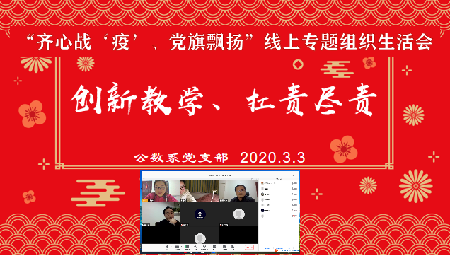 3月3日晚8点-9点半,公数系全体党员运用腾讯会议开展了以“创新教学、扛责守责”为主题的“齐心战‘疫’、党旗飘扬”云端专题组织生活会。会议由支部书记吴烨主持,认真地学习了:①学习习近平总书记对新型冠状肺炎疫情防控工作的重要指示批示精神;②中共湖南省委《关于加强党的领导、坚决打赢疫情防控阻击战的通知》;③《湖南省高等学校新型冠状肺炎疫情防控工作指南》;④云顶国际vip8866党委关于新型冠状肺炎疫情防控部署安排及系列通知要求;⑤长理官方公众号发布的疫情防控知识;向在战“疫”中涌现出的敢于斗争、敢于担当、敢于奉献的邓荣花老师学习等。