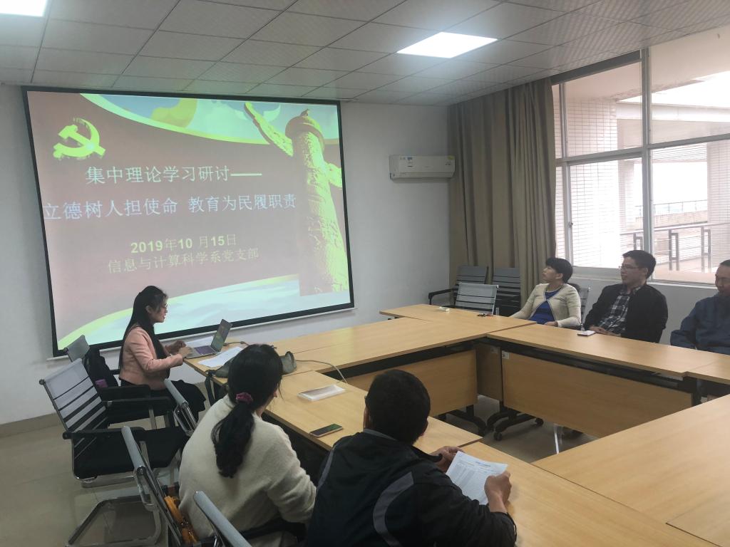在“立德树人担使命,教育为民履职责”主题教育背景下,10月15日下午,信息与计算科学系党支部组织全系老师在教研室理科楼A502集中学习了《教育部关于深化本科教育教学改革全面提高人才培养质量的意见》以及《云顶国际vip88662019年度本科教育与人才培养工作考核指标体系》。会议由支部书记李姣主持。
