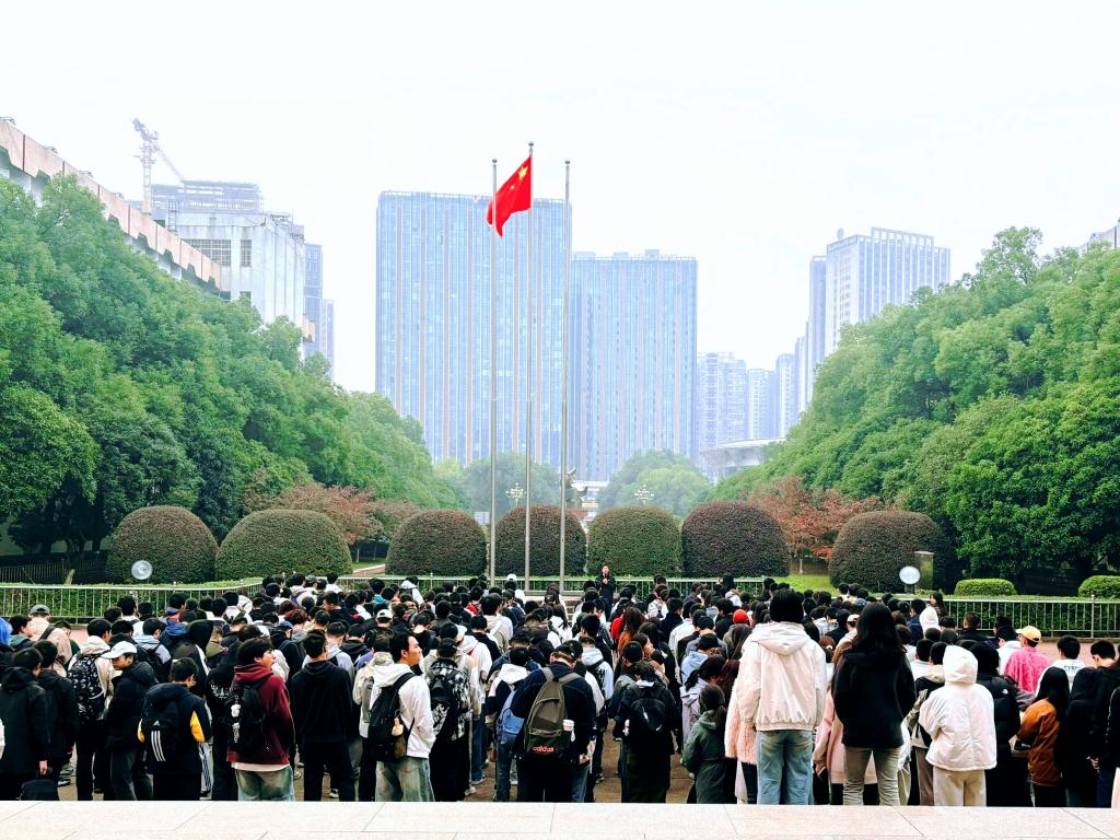 11月17日早上,我院在金盆岭校区办公大楼前坪举行庄严的升旗仪式。数统学院党委副书记兼副院长郑忠辉、助理辅导员曹坤鹏出席,2025级全体本科生参加。