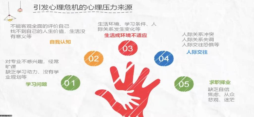 会议之中,郑忠辉在分析大学生引发心理危机的心理压力来源时首先指出是学业问题,其次是自我认知问题,第三是生活环境不适应,第四是人际交往问题,最后是求职择业问题,他建议同学们在大学期间多开展实践活动、校园文化活动等,以帮助更好地适应新环境,预防心理危机的发生。