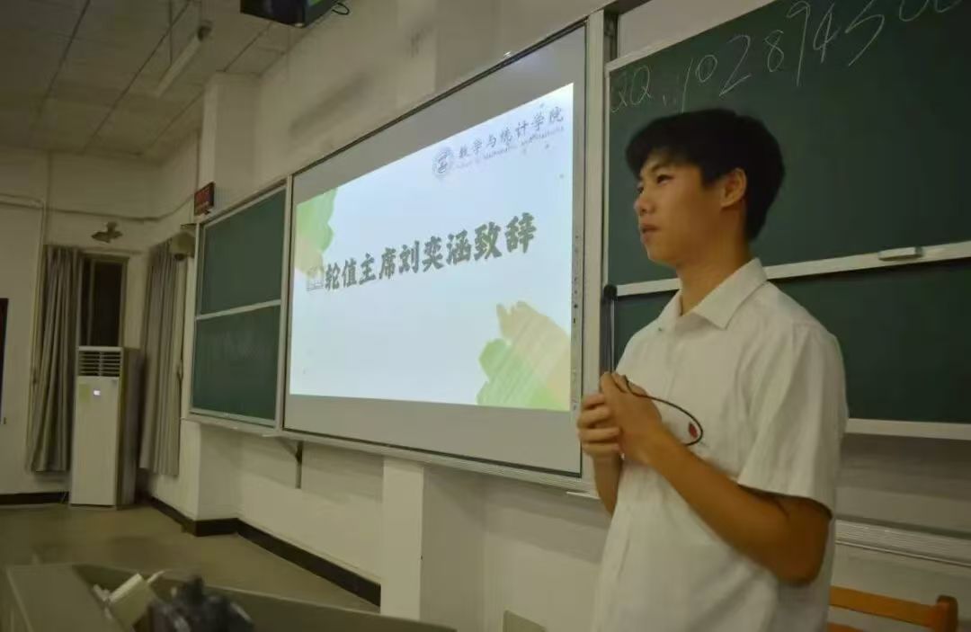 随后,由轮班主席刘奕涵进行发言,他结合自身经历,从技能、生活、人际三大方面讲述了自己加入团学的改变和收获,鼓励大家积极参与团学干部竞选,加入团学大家庭。