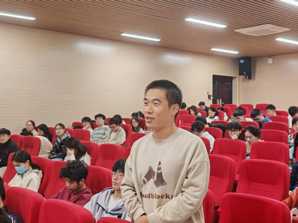 在互动问答环节,同学们踊跃提问,围绕“创业初期如何应对资金压力”“如何判断创意的市场潜力”等实际问题与张羽进行了深入交流。他结合自身经历,给出了务实中肯的建议,现场气氛热烈,掌声不断。