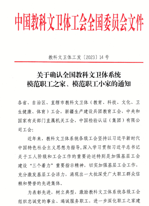 近日,中国教科文卫体工会下发了《关于确认全国教科文卫体系统模范职工之家、模范职工小家的通知》,土木学院分工会荣获全国教科文卫体系统“模范职工小家”称号。