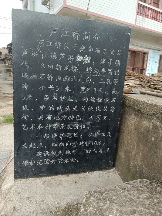 据该组调查,斩龙桥横跨在芦江河上,桥长56米,宽2.2米,高4米,桥有三拱,每拱为半圆形。在这斩龙桥的背后也曾有过一段悲痛的历史,1944年9月13日,日军深夜侵入芦洪市镇,连夜放火烧杀。芦洪市镇三条大街、300多间铺面化为灰烬,无数人举家无归。当时,芦江河上的斩龙桥是唯一一座通行桥梁,系重要的军事要地和交通咽喉部位。日军抵达后,在斩龙桥旁的“福兴堂”驻扎百余人,建立桥头堡,并在制高点狮子岭上修建工事,架设火炮阵地,日军入侵后的暴行给这座桥留下了不可磨灭的伤痕。
