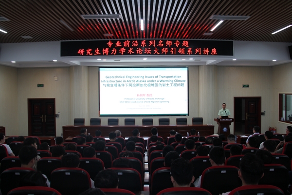 2025年6月11日,我院“专业前沿系列名师专题、研究生博力学术论坛系列讲座”邀请美国阿拉斯加大学杨朝晖教授为我院师生作了题为“Geotechnical Engineering Issues of Transportation Infrastructure in Arctic Alaska under a Warming Climate”的学术报告。报告会由张永杰副院长主持,各专业老师和研究生共计100余人参加了此次学术交流活动。