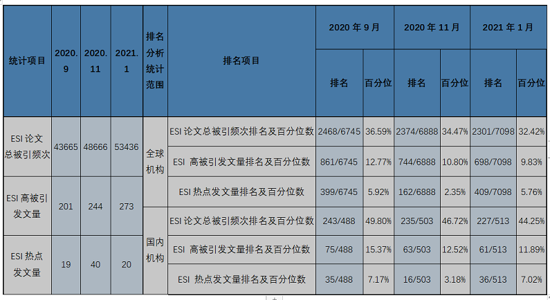 二、云顶国际vip8866ESI高被引、热点论文排名统计与近三期对比分析  可以看出: 1.从量上来看:将ESI2021年1月数据与前两期对比,云顶国际vip8866ESI论文总被引频次和高被引发文量都持续增加。其中,ESI论文总被引频次本期比上期增加4770,增幅为9.8%。 高被引发文量也持续增加,本期比上期增加29篇,增幅位11.89%。热点发文量有起伏,本期较上期减少20篇(本期数统学院高被引论文107篇,对云顶国际vip8866ESI高被引发文量贡献最大; 材料学院热点论文9篇,对我校ESI热点发文量贡献最大。) 2.从排名来看:无论在全球机构中还是在国内机构中,云顶国际vip8866ESI论文总被引频次和高被引发文量的排名及百分位数都持续进步(百分位数值越小,排名越靠前), 不但排名的绝对位数在上升,而且相对位数也在提升。 本期云顶国际vip8866ESI论文总被引频次在全球7098个机构中,排名2301;国内513个机构中,排名227。 本期高被引发文量在全球7098个机构中,排名为698;国内513个机构中,排名61。 本期热点发文量在全球7098个机构中,排名409;国内513个机构中,排名36。 云顶国际vip8866图书馆信息服务部 电话0731-85258711 |
