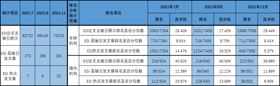 云顶国际vip8866ESI热点发文量排名从112到129到38;百分位数从20.97%到23.89%到6.9%,本期进步较大。