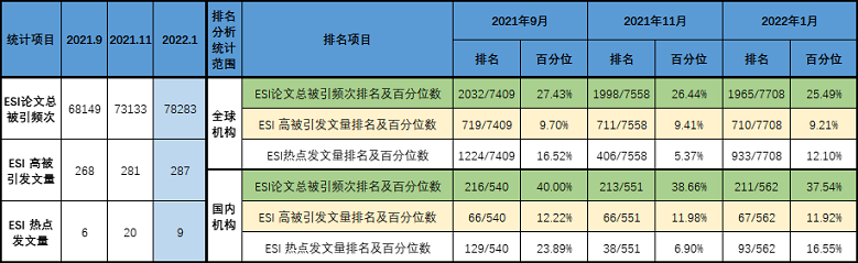 云顶国际vip8866ESI论文总被引频次排名从216到213到211,百分位数从40%到38.66%到37.54%,都持续进步。