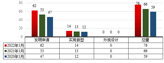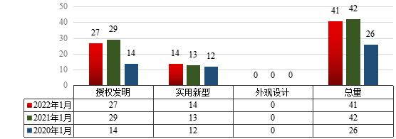 图1 2022年1月云顶国际vip8866专利申请类型分布及近两年同期申请情况