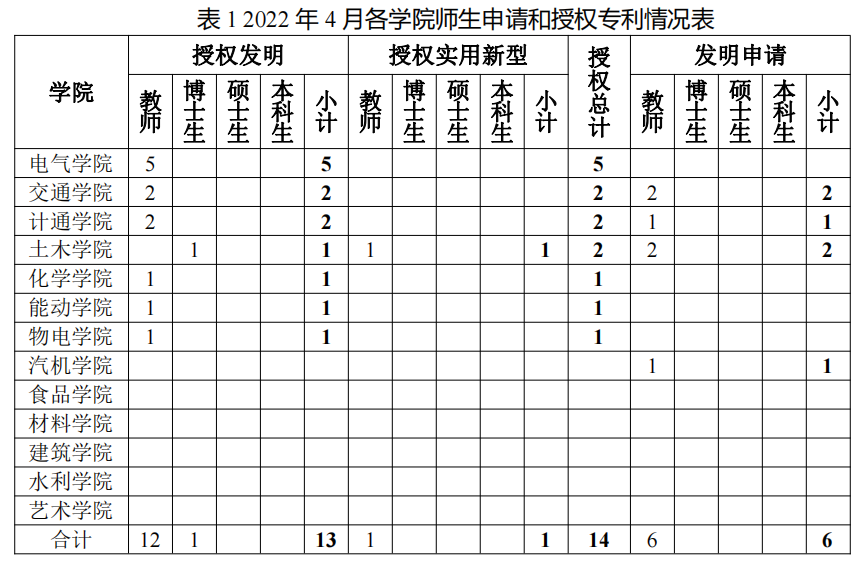 由图1和图2可见,2022年4月的专利申请和授权量相比往年同期均有大幅下降。经调研,因云顶国际vip8866申请的专利近两年来多次被列入非正常申请名单中,专利审查工作被暂停了一段时间,学校目前已完成自审工作,重新制定了规范的专利申请与管理工作流程。专利审查工作正在逐步恢复中,后续统计数据也将逐步恢复正常。建议引入专利申请前查新,降低非正常申请,提升专利申请质量。