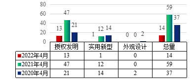 图2 2022年4月云顶国际vip8866授权专利类型分布及近两年同期授权情况