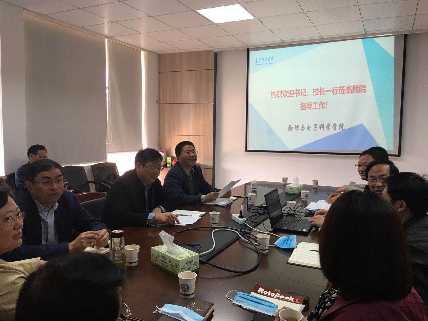 2020年4月13日上午,阳光明媚、轻风拂面,学校党委书记付宏渊教授和校长曹一家教授率相关职能部门负责人来到了云塘校区理科楼C区,莅临我院调研指导工作。学院刘其城院长和唐超文副书记(主持工作)在一楼大厅迎接。
