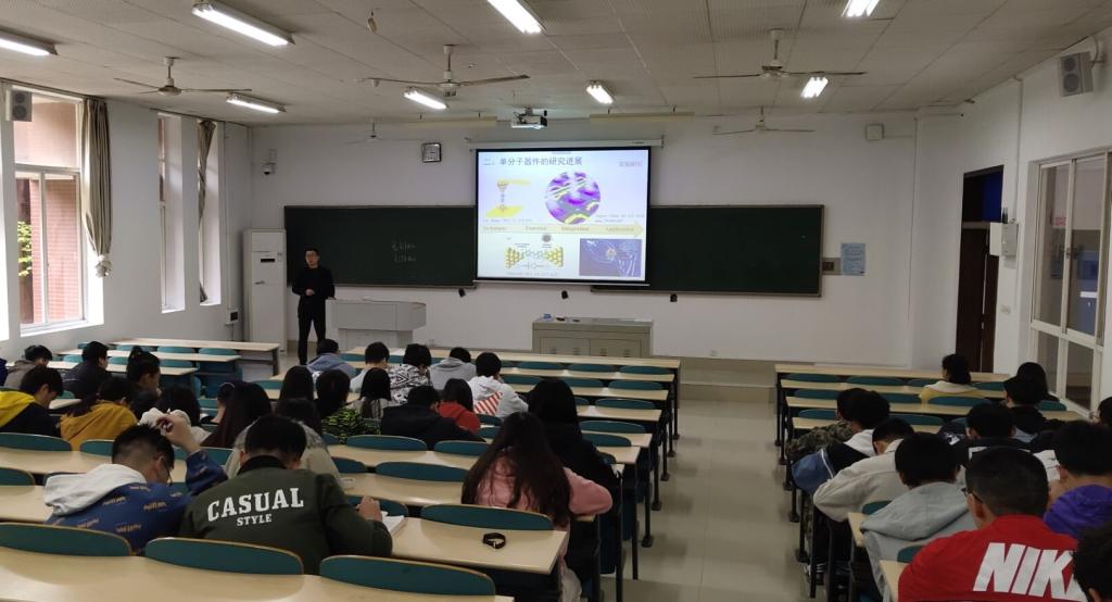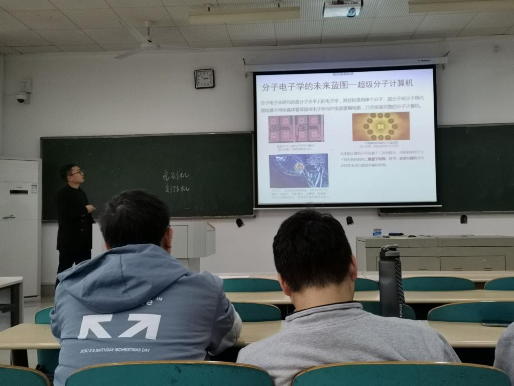本次讲座的主题为《“小分子,大有可为”—分子电子器件的研究现状》,伍丹老师结合国产芯片“卡脖子”的难题,深入浅出从小分子的电学性质、分子电子器件的研究现状、分子电子器件领域有待探索和解决的问题三方面展开讲座。期间,他以“科学家的好奇心”为引,解释并分享了分子电子学的发展、超级分子计算机、分子材料、分子器件等方面的前沿知识。同时,结合自身科研经历,生动具体的介绍了初涉科研的基本方法,并强调信息检索与快速阅读理解能力的重要性,为初涉科研的同学们提供了新的思路。