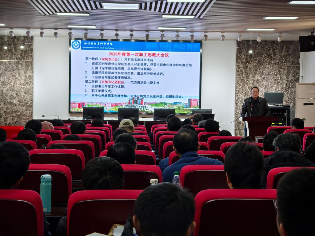 2025年1月14日下午,物电学院在理科楼B413会议室召开了第五届五次教职工暨工会会员大会,会议由学院常务副院长邓科主持,学院党委书记张国强作重要发言。