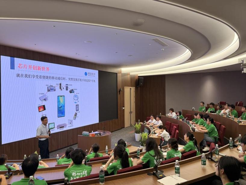 参观后,进芯学院总导师、湖南大学教授陈迪平为同学们带来的《走进芯片》专题讲座成为此次研学最大的亮点。讲座以全球“芯片战争”为切入点,系统梳理集成电路发展脉络与制造工艺演进历程,深入透彻地剖析产业链变迁及芯片设计创新路径。陈迪平直面产业发展面临的重重挑战,精准解读蕴含其中的发展机遇,并寄语青年学子:“在国家‘芯’征程上,你们重任在肩,要勇攀科技高峰,用智慧和汗水破解产业发展难题。”