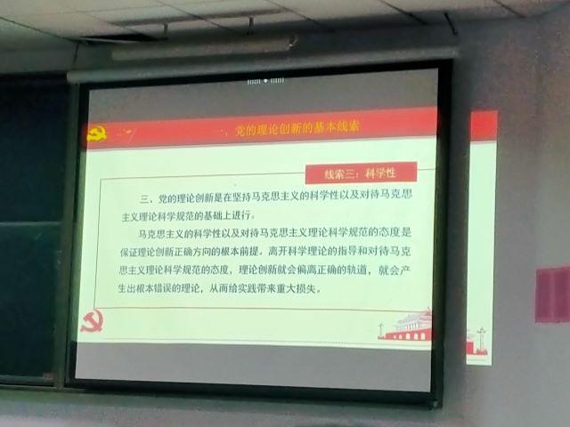 王威峰老师由“什么是党的理论创新?”的问题,开启了此次党课。他讲到:党的理论创新,是指对党的基本理论、路线、方针和政策进行科学的调整以适应并促进党的建设、革命及现代化事业持续快速而健康发展的过程。理论创新的三要素分别是“科学性、实践性、创新性”。