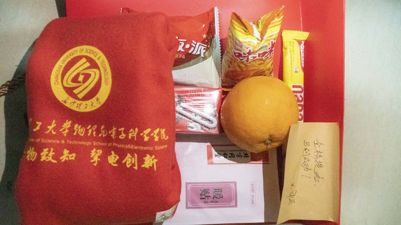 中午,各班主任老师和学工办老师带着大礼包走进了考研学子的寝室,亲切地询问考研学子的近况,并且送上了大礼包和温馨的祝福,收到大礼包的同学脸上洋溢着幸福的笑容,纷纷表示不会辜负老师的期望和自己的努力,以优异的成绩回报学校及学院的培养和关怀。有同学说到:“很喜欢大礼包中那条印有物电学院logo的“逢考必过”红围巾,感觉整个学院的温情和关怀都系于其上。”活动在愉快和温馨的氛围中进行。