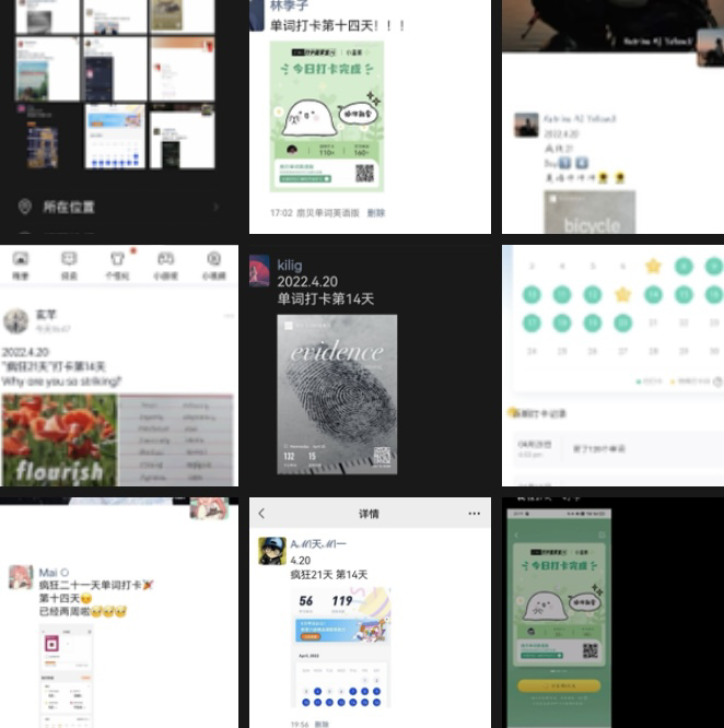 “疯狂21天”打卡活动分为考研和六级两个赛道,同学们根据自己的学习情况选择不同的赛道。英语单词打卡活动一经开展便得到了同学们的积极响应,大家纷纷踊跃报名,迫不及待地参与其中。在单词打卡的过程中,同学们每天都按质按量地上传打卡的英语单词。大家不是“三分钟”热度,而是把每天都当做全新的挑战,一天天过去,随着练习的单词数目逐渐积少成多,掌握的单词数目越来越丰富,积土成山,积水成渊,每天单词多掌握一点,离梦想的距离就近一点。大家一起打卡,互相督促,互相进步,学习氛围十分浓厚,最后有许多同学都成功地完成了打卡的计划。