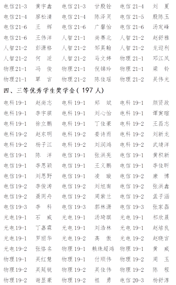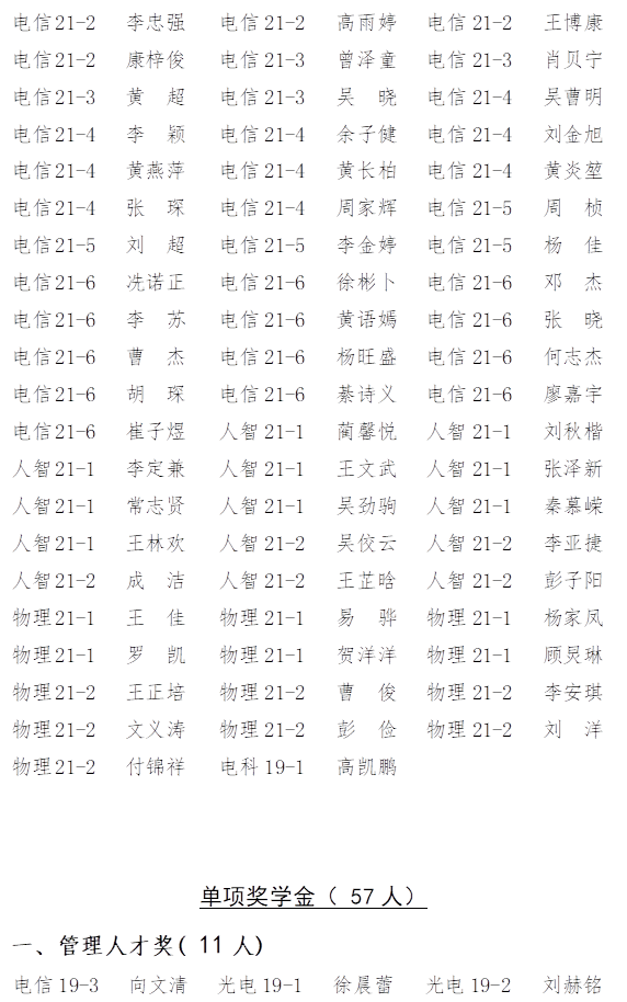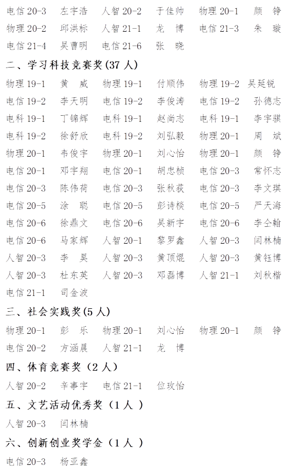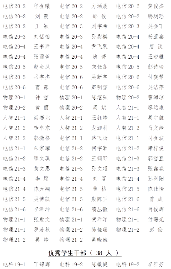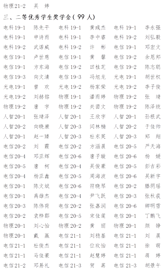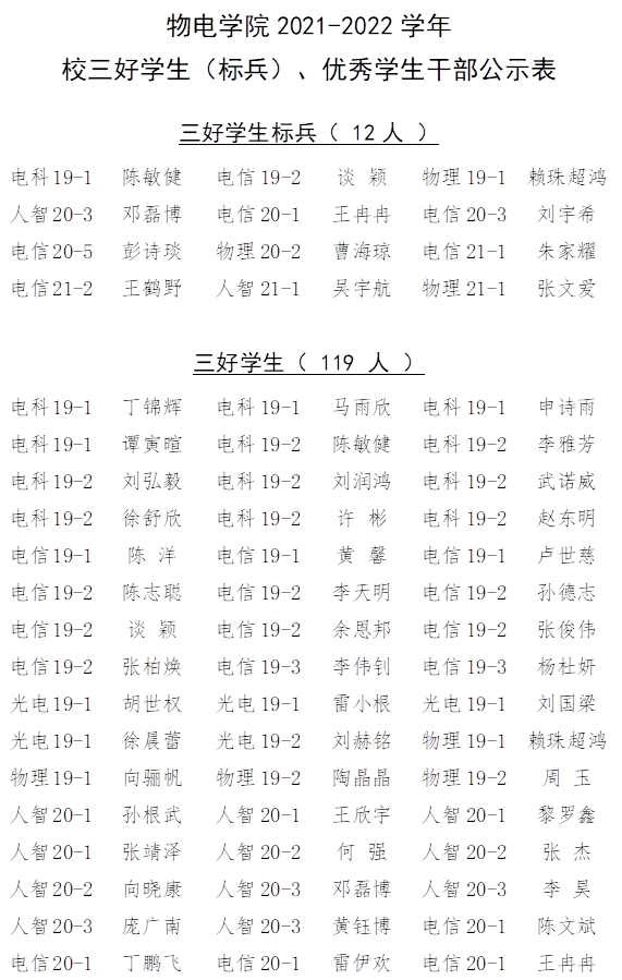 根据《云顶国际vip8866综合测评及评奖评优管理办法》的要求,经个人申请,班级推荐、物理与电子科学学院2021-2022学年奖学金与三好学生、三好学生标兵、优秀学生干部经评审委员会认真评审,现将名单公示如下: