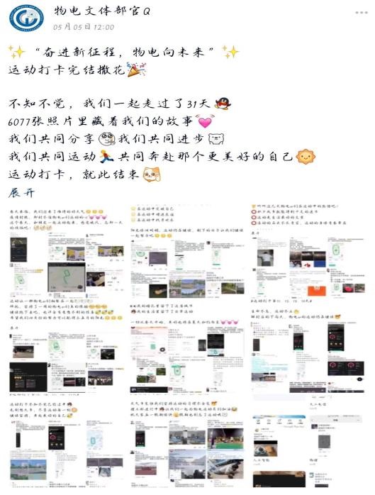 本次活动共收集到6077张运动打卡截图,其中是物电学子们共同运动,一起进步的身影。运动打卡,就此结束;运动健身,来日方长!希望今后大家也能继续坚持运动,拥有健康体魄!