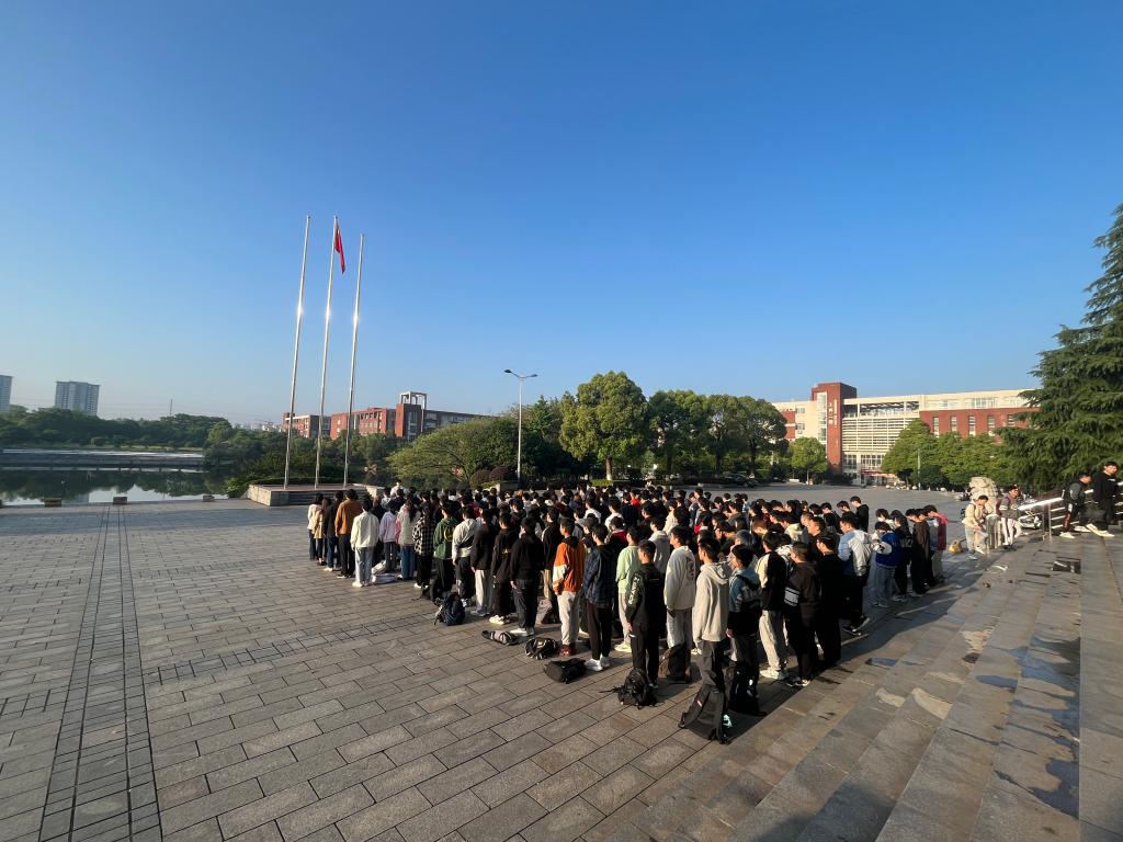 4月26日,物理与电子科学学院于云塘校区图书馆前坪举行升旗仪式,院党委副书记宋国宁、各年级辅导员及22级人工智能和物理学专业全体同学参加本次升旗仪式。