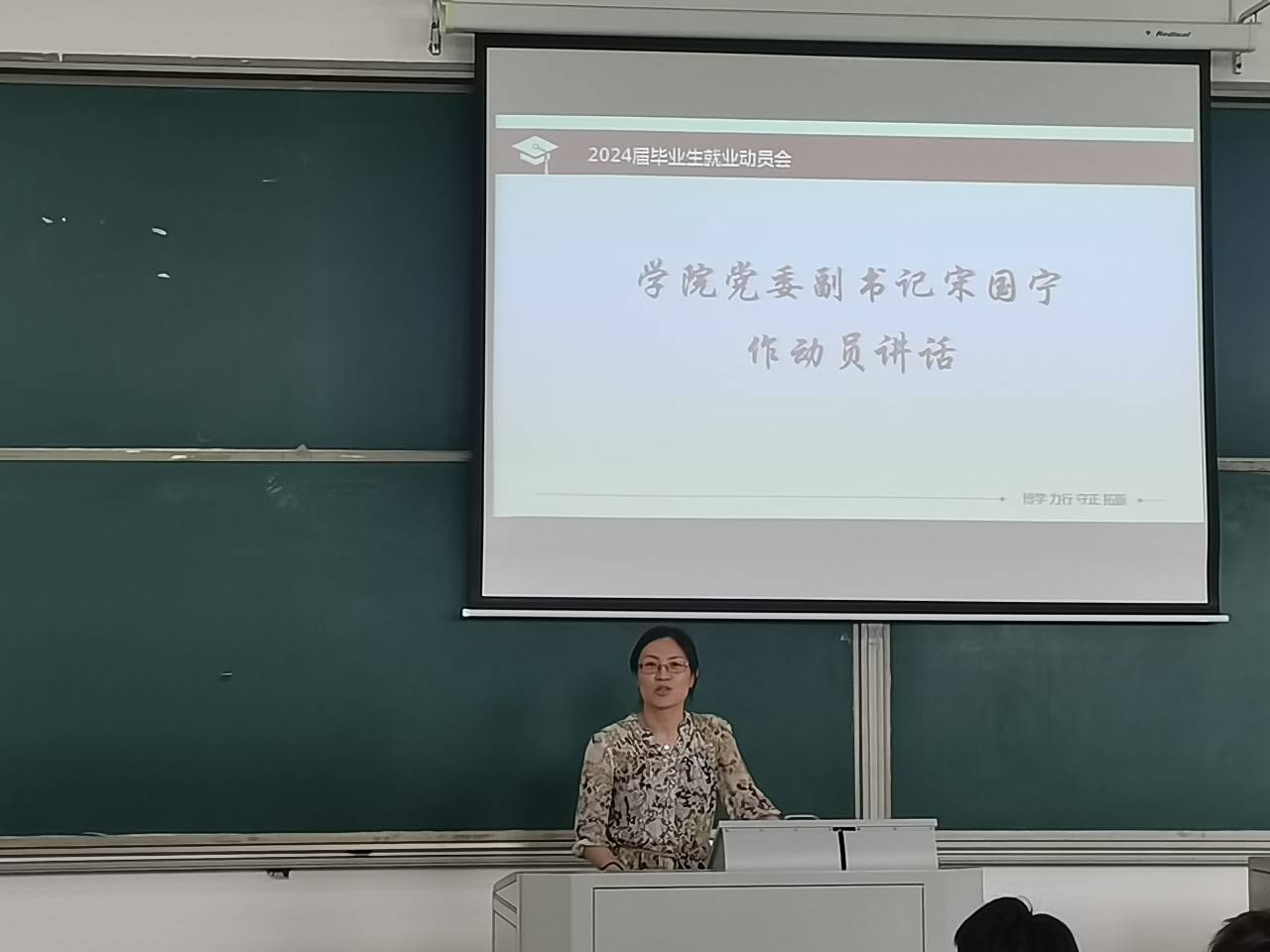 学院党委副书记宋国宁向同学们介绍了学院2023届毕业生的就业情况,并从毕业生人数增加、整体经济形势的发展等角度,对2024届毕业生就业形势进行了分析。宋国宁鼓励毕业生要解放思想,开阔视野,拓宽就业范围,积极参加各种招聘会,摒弃“慢就业”;历练本领,提高就业竞争力;要积极就业,争做学校学院的优秀校友,承担责任,回馈社会。