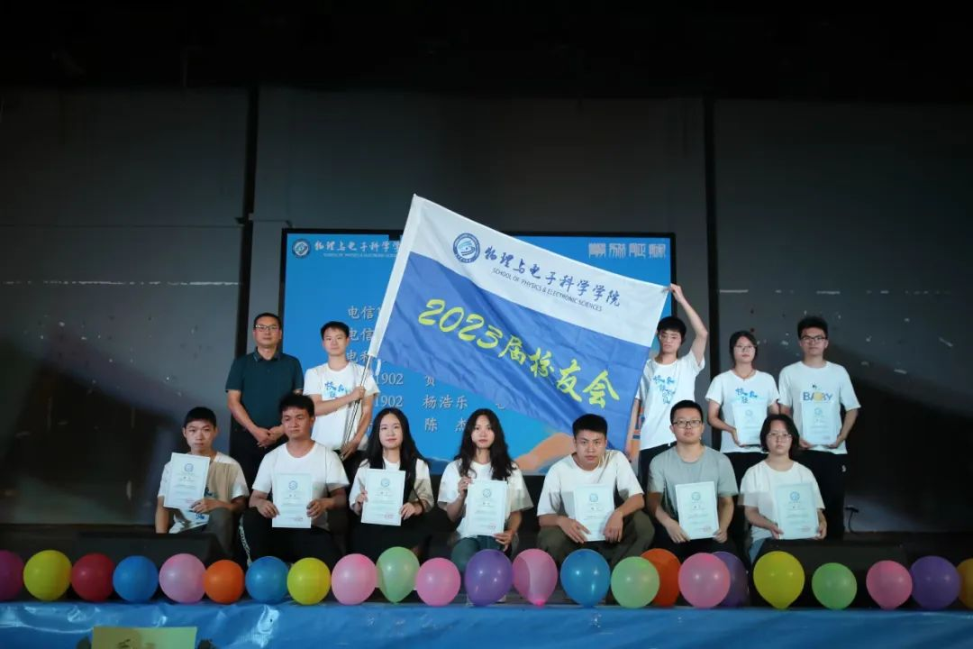 到了大家都很期待的表彰环节。物电学院副院长张卫兵宣读了“湖南省优秀毕业生”表彰文件并进行了颁奖。晚会成立了学院校友分会并由物电学院党委书记张国强颁发聘书并授旗。