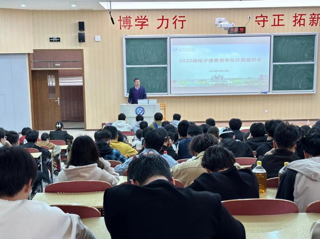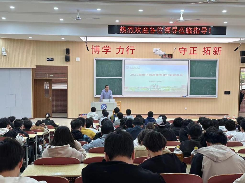 3月22日13:00,物电学院2022级电子信息类专业分流宣讲会在综教B102和B202教室举行。学院副院长张卫兵(主持工作)、副院长范志强、电子信息系老师文勇军、商雄军、唐俊龙以及2022级辅导员马凯文出席参与了此次活动,会议由学院党委副书记宋国宁主持。