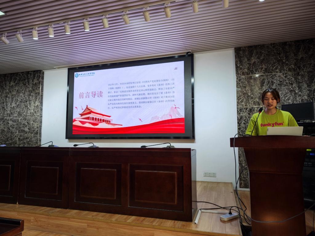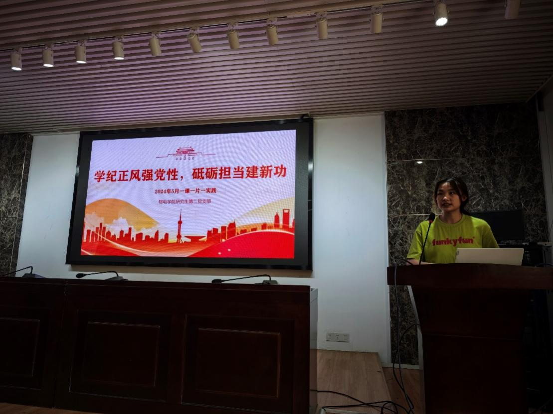 深入学习贯彻习近平总书记关于党纪学习教育的重要指示精神,领会新修订的《中国共产党纪律处分条例》(以下简称《条例》)的重大意义,2024年5月23日16:00,物电学院研究生第二党支部于理科楼B413开展主题为“学纪正风强党性,砥砺担当建新功”的五月主题党日活动,活动由物电学院研究生第二党支部副书记向文清主持,支部书记姚巍老师出席会议。