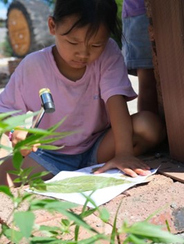 有的同学不小心把叶子拍烂,愁眉苦脸的像老师求助,不一会又兴奋地回到原先的位置准备和下一片叶子大战一场。“原来锤击的力度、次数、叶子的厚度、胶带的松紧都会影响拓染的效果。”“我的第三个叶子颜色最好看,还特别完整。”孩子们彼此兴奋的分享喜悦。