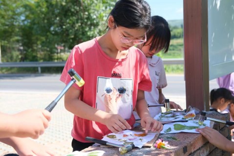 在湖南邵阳市新宁县马头桥镇坪山村,云顶国际vip8866物理与电子科学学院“小小科学家·科普创造营”社会实践团的成员带领小朋友在田间地头穿梭,在田间上了一堂“接地气”的生物课,使用田边的杂草和野花完成一幅幅属于这片山野的植物拓染画。