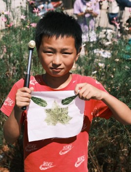 孩子们钻进草丛里,找寻自己心仪的叶片,小心翼翼在纱布上铺好,经胶带固定后便开始了“敲拓”之旅。一下下锤子落地的声音震荡在田野上方,最后孩子们竟默契的把握出一种节奏,十几把锤子同时落地,形成响亮的共振。