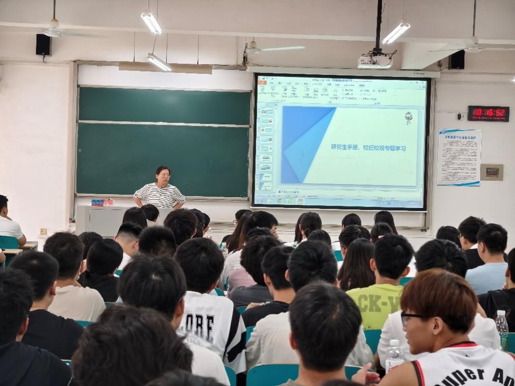会上,杜老师首先结合《研究生手册》中的培养管理规定,详细介绍了培养工作流程,解读了相关专业的培养方案。随后,她强调了课程学习与考试、学位论文撰写各个环节的重要事宜,并结合实际案例,告诫同学们及早制定目标,养成学习习惯,深入专业领域,与导师、同学加强沟通,度过充实的三年研究生学习生活。