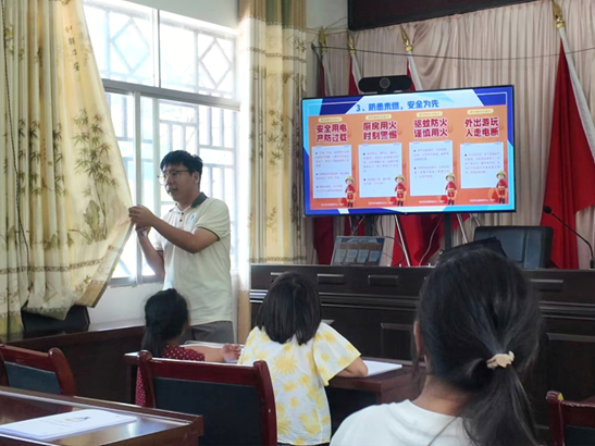 桑植县走马坪村地处山区,溇水支流穿境,夏季溪流水位上涨、水流湍急,对当地儿童构成溺水隐患。“照片里的池塘水面清澈,能随意下去游泳吗?”实践团成员张华清以桑植县溇水的照片为例问小朋友。“不能!”一位小朋友大声回答道,“野外的水里有暗流,会把人冲走的。”张华清用彩图讲解 “六不准”“四牢记”安全准则,通过快问快答、顺口溜加深印象,还示范仰漂、踩水等自救法,教孩子用树枝、空水瓶等物品展开智慧救援,孩子们学得认真,互相纠正动作。