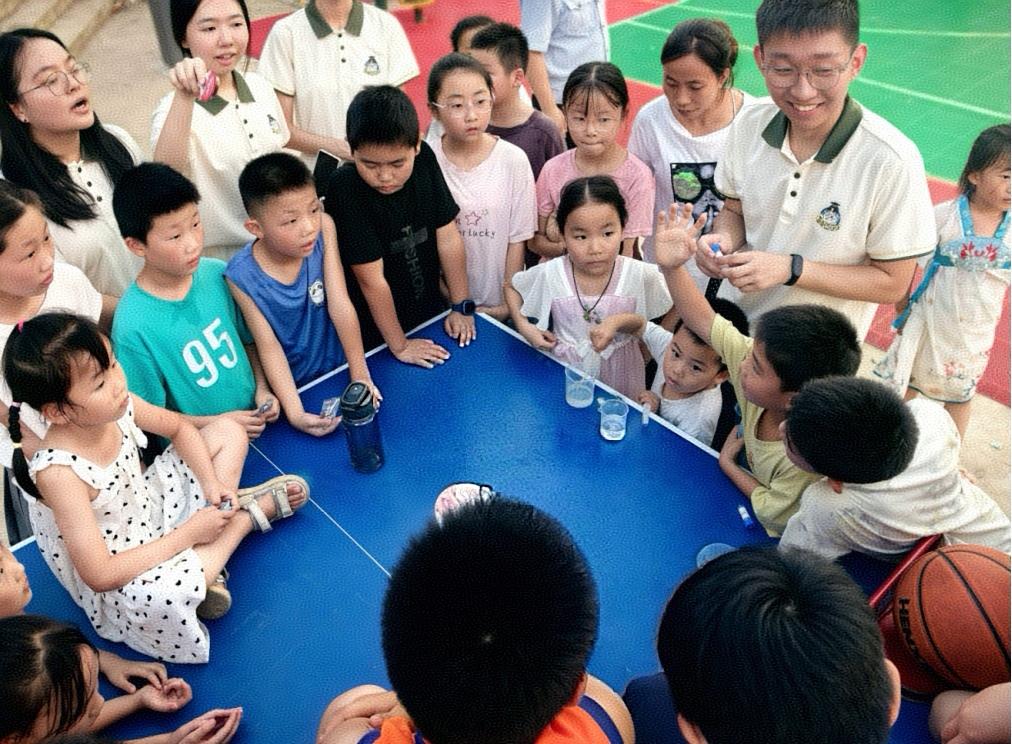 “哇!水变蓝了!像星星掉进瓶子里!”湖北省广水市关庙镇的广场上炸开一片欢呼。7月13日下午,云顶国际vip8866物理与电子科学学院“小小科学家”科普志愿队带领当地的孩子们玩起了神奇的蓝眼泪实验。