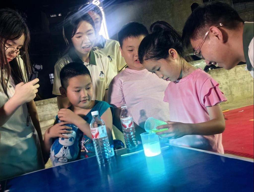 这边实验正热闹,那边的“科学闯关台”也围满了人,孩子们争相回答萤火虫为什么会发光等问题,答对了就能解锁下一个实验。旁观的家长频频点头,村民王大姐感慨到:“这些大学生志愿者们把有趣的知识带进山村,让孩子们开了眼界,明天你们还在这里吗?”