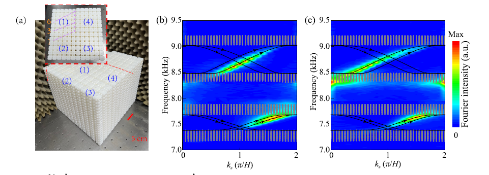 图1. 具有规范场的轨道声子晶体(a),理论和实验观察到的双重旺尼尔循环(b) 和 (c).