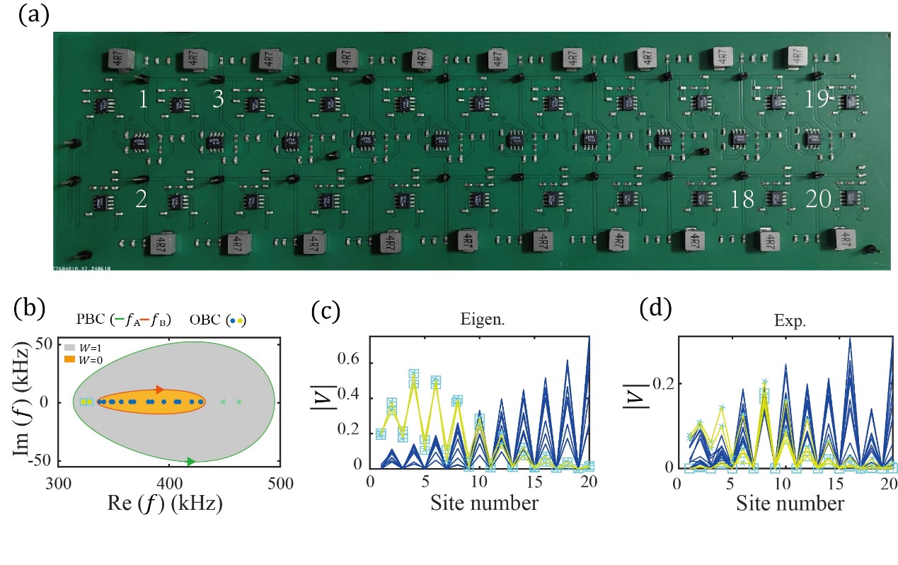 图1. (a)非厄米电路实验样品。(b)周期边界谱和开边界谱。(c)本征态的电压场分布,表现出向左和向右趋肤。(d)趋肤效应实验测量结果。