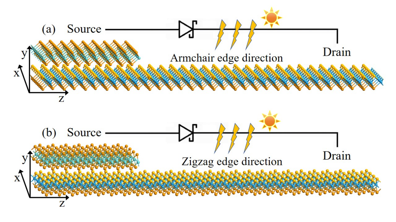 图1. 1T-MoTe2/WSeTe和1T-MoTe2/MoSeTe异质结沿(a)扶手椅边缘方向或(b)锯齿边缘方向传输的肖特基二极管示意图。