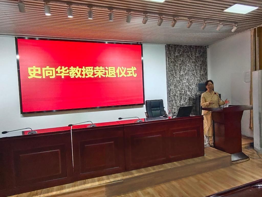 史向华教授向学院领导和老师们精心安排这么一场荣退仪式表示感谢,她表达了自己从教近四十年的感受,从1979年入大学读书到成为一名大学教师,期间见证了祖国高等教育的发展和壮大,看到自己培养的学生个个成为祖国建设的栋梁之才感到无比满足和幸福,看到学校和学院的快速进步感到开心和快乐。感谢学校的培养,感谢同事们的关心和支持,虽然即将步入退休生活,但会时刻关注学校和学院的发展,祝福学校和学院的明天更加美好。