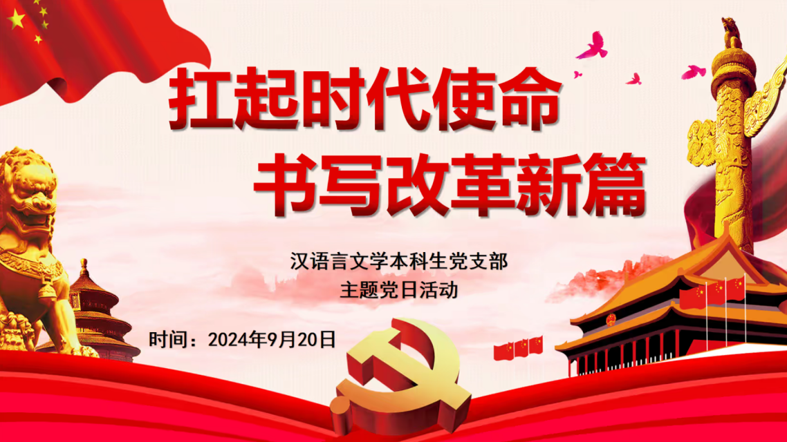 为深入推进主题教育,感悟思想伟力,严格落实“三会一课”,夯实支部“一月一课一片一实践”活动要求,2024年9月16-20日,文新学院各学生党支部开展以“扛起时代使命,书写改革新篇”为主题的9月党日活动。