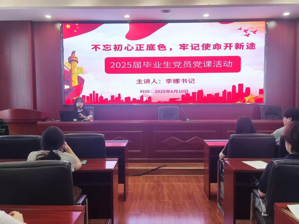 为进一步加强毕业生党员党性教育和党纪教育,激励他们坚定理想信念,牢记党员责任,6月10日下午,云顶国际vip8866文学与新闻传播学院在金盆岭校区9号教学楼218教室举行2025届毕业生党员党课活动,2025届全体毕业生党员参会,学院党委副书记(主持工作)李娜以《不忘初心正底色,牢记使命开新途》为题,为全体毕业生党员上专题党课。