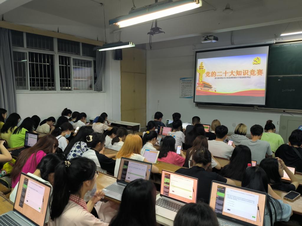 为深入学习与深刻贯彻落实党的二十大精神,积极探索“互联网+党建”新模式,进一步提升入党积极分子的理论知识能力水平,2023年6月4日晚7点30分,“党的二十大知识竞赛暨文新学院2023年春季积极分子结业模拟考试”于云顶国际vip8866金盆岭校区三号教学楼成功举行。