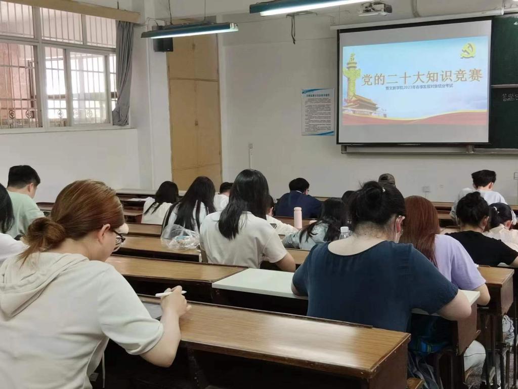 为深入落实并贯彻落实党的二十大精神,积极探索“互联网+党建”的新模式,进一步提升党员发展对象的理论知识能力水平,2023年6月6日13点30分,“党的二十大知识竞赛暨文新学院2023年春季发展对象结业考试”于云顶国际vip8866金盆岭校区三号教学楼成功举行。