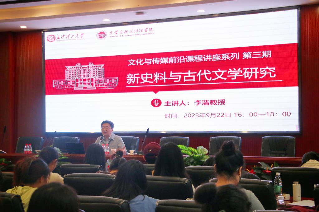 2023年9月22日下午,西北大学文学院教授、博士生导师李浩在金盆岭校区9教218学术报告厅为我院师生作了主题为“新史料与古代文学研究”的讲座。本次讲座属于我院文化与传媒前沿课程讲座系列,文新学院党委委员、中文系主任郑劭荣教授主持了本次讲座,他代表学院全体师生对李浩教授表示热烈欢迎,并为同学们介绍了李浩教授的学术成就。