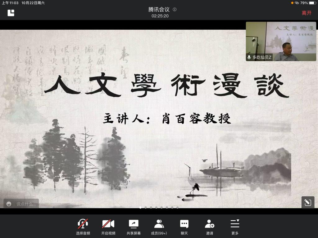 本次讲座线上、线下同步进行,文新学院副院长周云鹏副教授、党委委员郑劭荣教授、中文系王雨佳老师出席讲座,中文系黄莹老师、黄宇老师等也以线上形式参与。郑劭荣教授担任主持人并进行了开场发言,他对肖百容教授的到来表示了热烈欢迎,简要讲述了我院与湖师大文学院在学科、师从关系等方面的重要渊源。