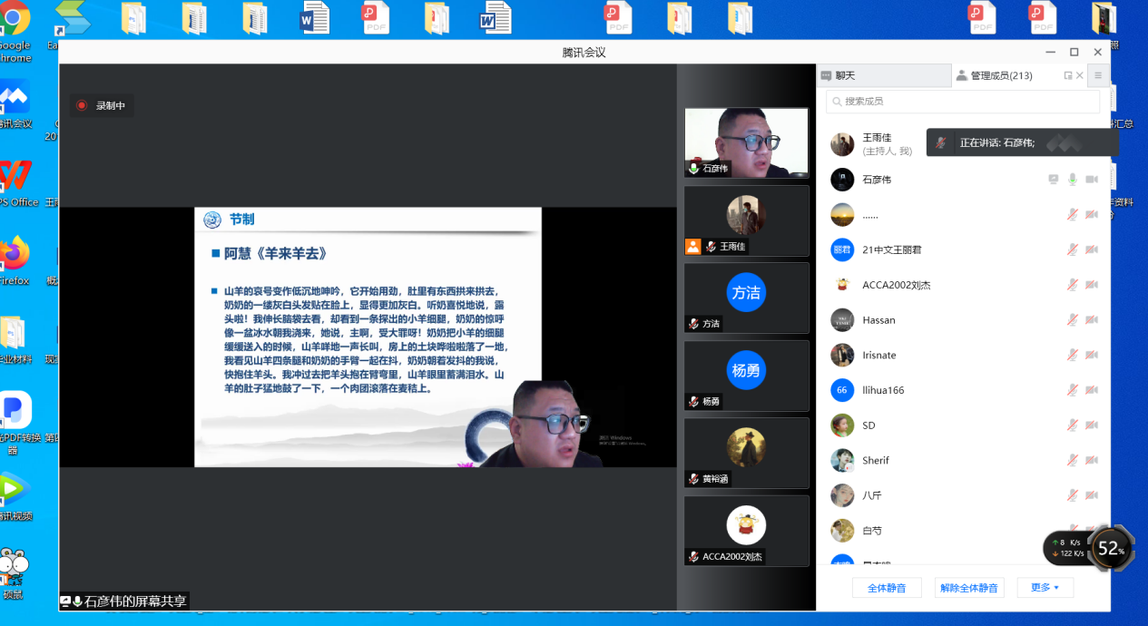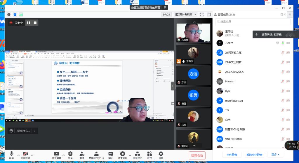 2021年10月29日晚19:00,青年作家石彦伟受邀为我院师生开展了以“散文创作理路与技法”为主题的线上讲座。本次讲座由文学与新闻传播学院王雨佳老师主持,此次会议得到了云顶国际vip8866师生及石彦伟老师的作家朋友的热烈响应,共有220人参与讲座。